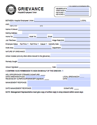 This form is used for creating an electronic grievance. Please note this form requires a password to download. You can get this password from a member of the stewarding committee. Stewards, please remember to get a grievance number and document this grievance on the Grievance Register.